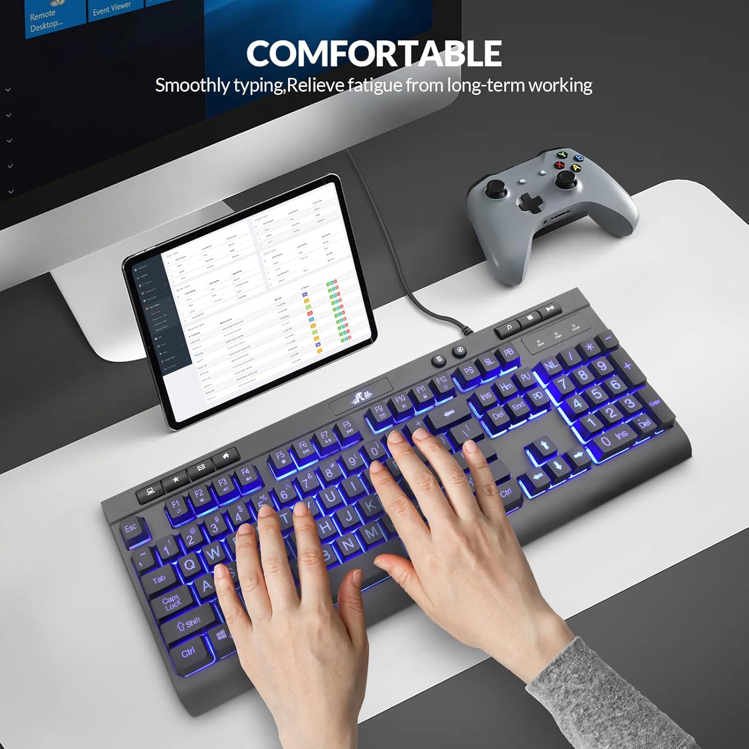 Full-size and ergonomic design:This full-size keyboard has 113 keys, including a numeric keypad and multifunction media keys. The foldable stand on the back of the keyboard is ergonomically designed to reduce wrist fatigue after prolonged use
